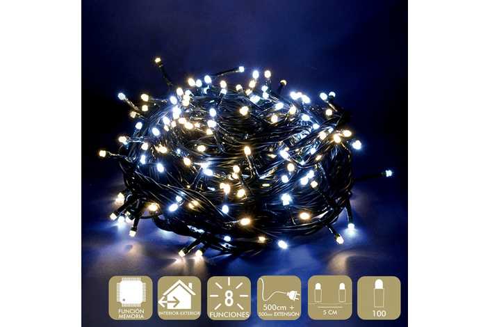 GUIRNALDA A LA RED ELÉCTRICA. 3,6 W.USO INTERIOR / EXTERIOR. IP44. CABLE VERDE. 8 FUNCIONES. LONGITUD CADENA 500 CM + 500 CM DE EXTE NSIÓN. DISTANCIA ENTRE BOMBILLAS: 5 CM.