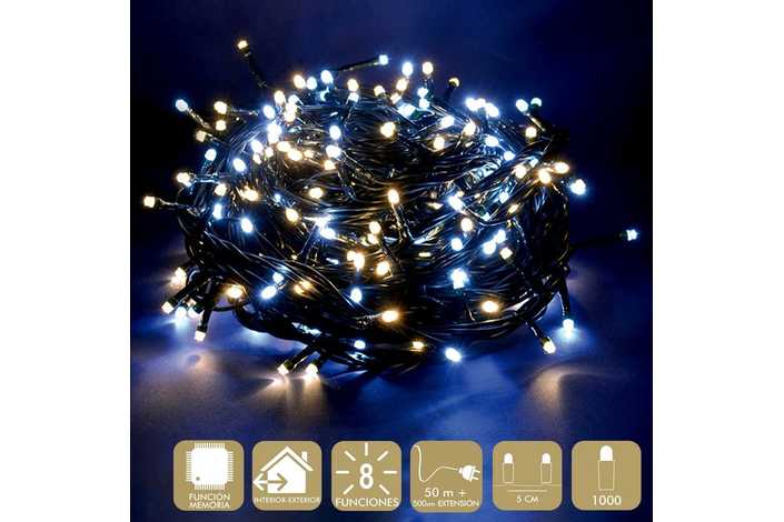GUIRNALDA A LA RED ELÉCTRICA. USO INTERIOR / EXTERIOR. IP44. CABLE VERDE. LONGITUD CADENA 50 METROS + 500 CM DE EXTENSIÓN. DISTANCIA ENTRE BOMBILLAS: 5CM. CAJA LITOGRAFIADA DE 25 X 20 X 18 CM.