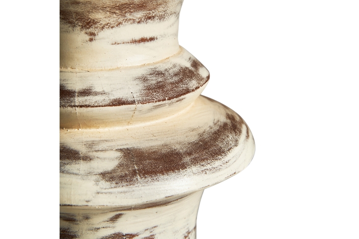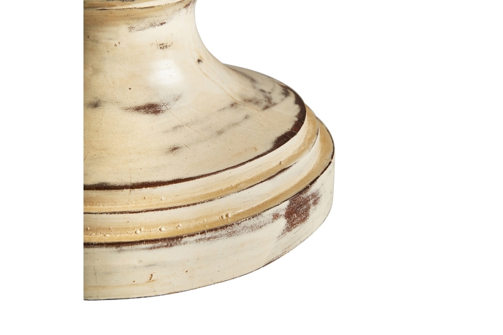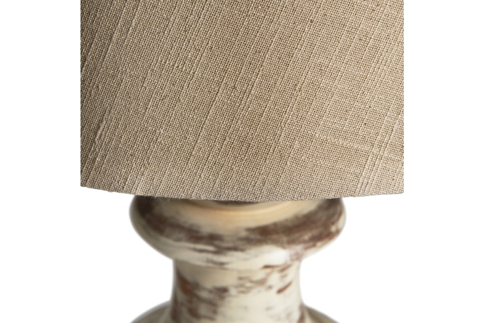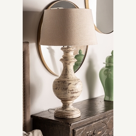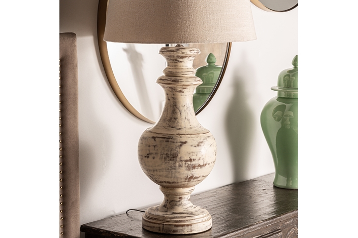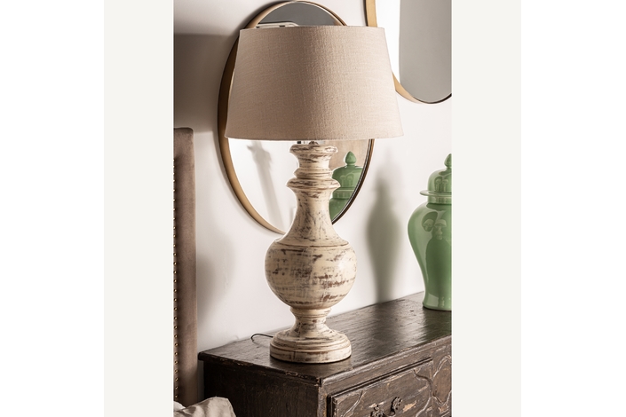 Lámpara de sobremesa, en color blanco decapado, de estilo provenzal. Fabricado en madera de mango, combinado con algodón.