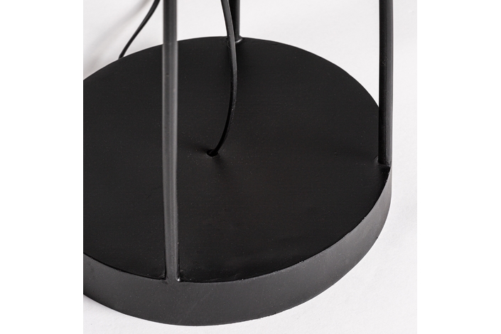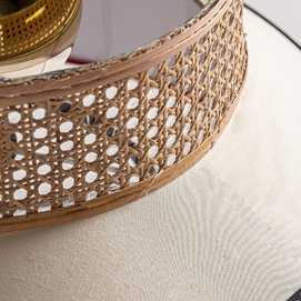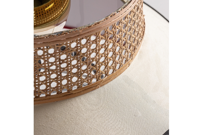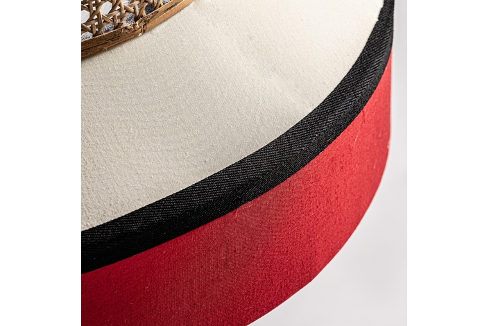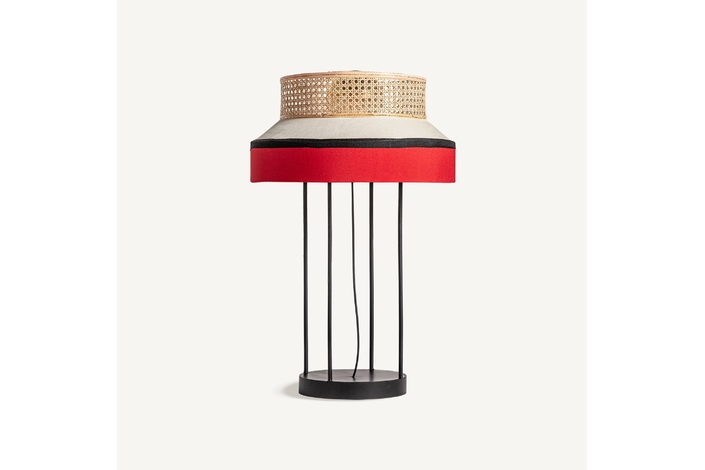 Lámpara de sobremesa, en color blanco/rojo, de estilo kitsh. Fabricado en ratán, combinado con algodón y hierro.