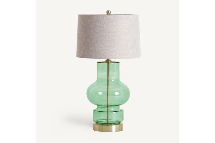 Lámpara de sobremesa, en color verde, de estilo clásico. Fabricado en vidrio, combinado con hierro y lino. Producto desmontable.