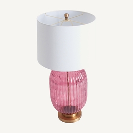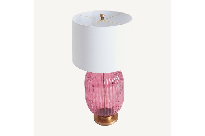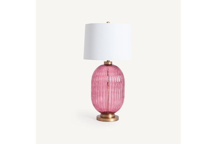 Lámpara de sobremesa, en color rosa, de estilo kitsh. Fabricado en vidrio, combinado con hierro y lino. Producto desmontable.
