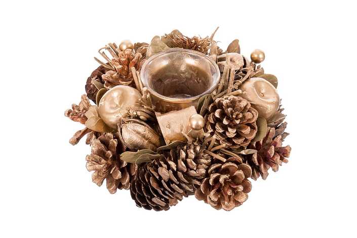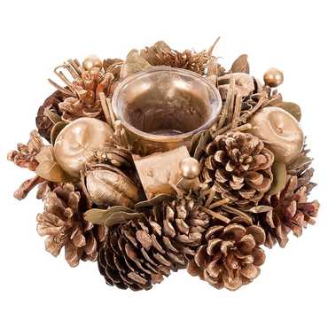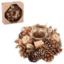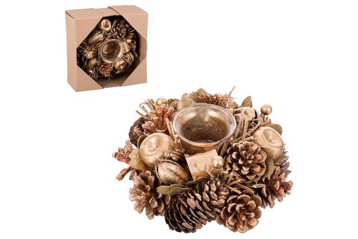 PIÑAS, HOJAS Y MANZANAS EN TONOS DORADOS. PRESENTACIÓN: EN CAJA VENTANA. TAMAÑO PORTAVELAS DE CRISTAL: 6 X 4 X 4,50 CM.