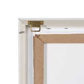 Marco blanco de poliestireno. Grosor del marco: 3,5 cm. Incluye colgador para su correcta sujeción.