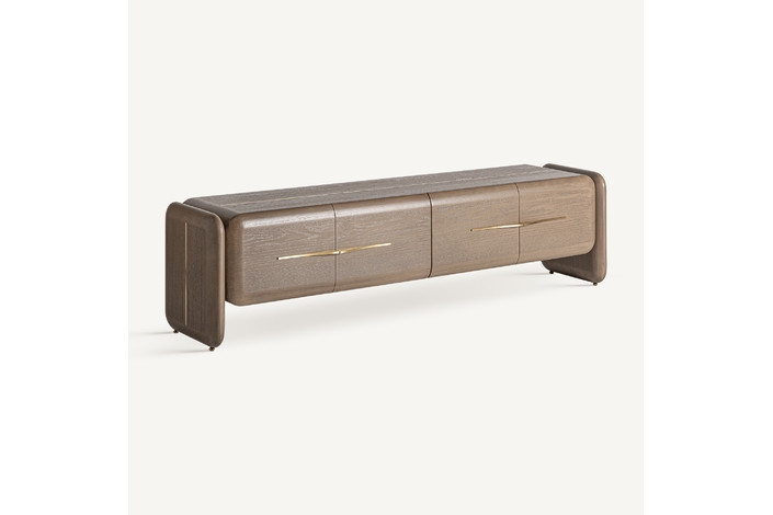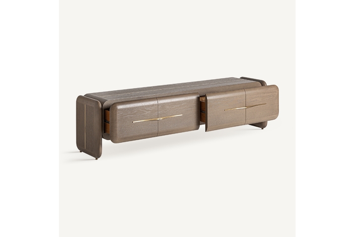 Mueble tv. Fabricado en madera roble, combinado con latón.