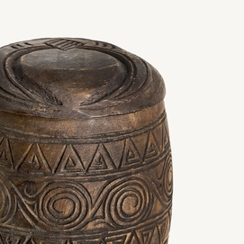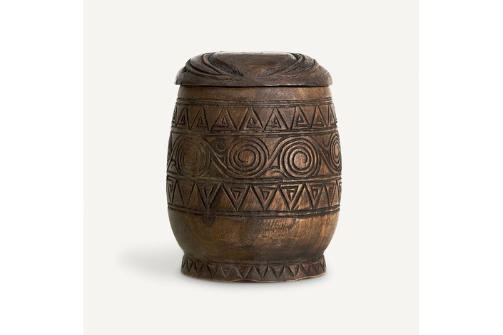 Caja redonda, en color marrón envejecido, de estilo oriental. Fabricado en madera de acacia.