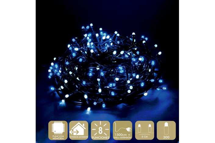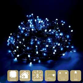 GUIRNALDA A LA RED ELÉCTRICA 3,6 W. USO INTERIOR / EXTERIOR. IP44. CABLE VERDE. LONGITUD CADENA 1500CM + 500 CM DE EXTENSIÓN. DISTAN CIA ENTRE BOMBILLAS: 5CM. CAJA LITOGRAFIADA DE 19,5 X 13 X 9,5 CM.
