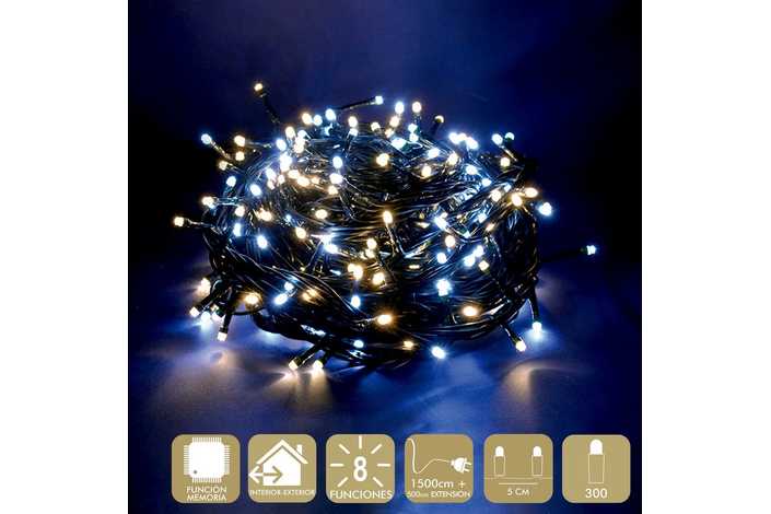 GUIRNALDA A LA RED ELÉCTRICA 3,6 W. USO INTERIOR / EXTERIOR. IP44. CABLE VERDE. LONGITUD CADENA 1500CM + 500 CM DE EXTENSIÓN. DISTAN CIA ENTRE BOMBILLAS: 5CM. CAJA LITOGRAFIADA DE 19,5 X 13 X 9,5 CM.