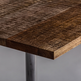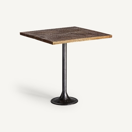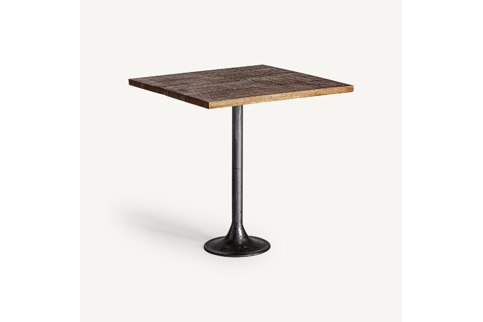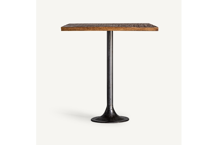 Mesa de bar de tonos marrones y negros inspirada en el estilo vintage. La pierna de hierro de la mesa aúna exclusividad con la calidez de la madera de mango. Una pieza que, gracias a los materiales que la constituyen, resiste al paso del tiempo conservando su aspecto y resistencia.