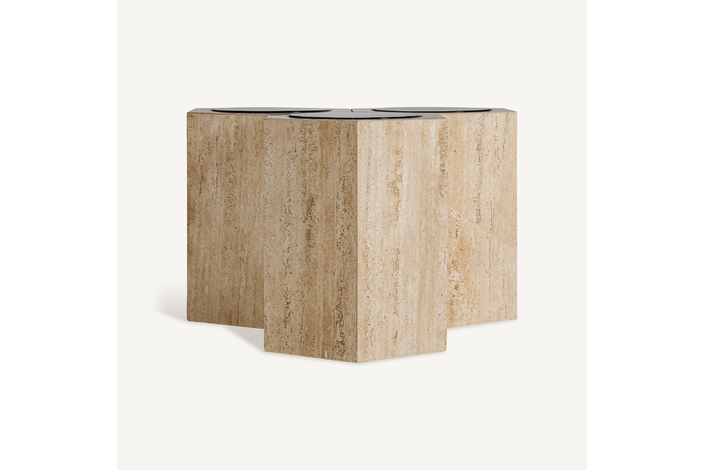 Mesa auxiliar thiennes, de estilo art deco. Fabricado en travertino, en color marrón claro, combinado con cristal, en color ambar.
