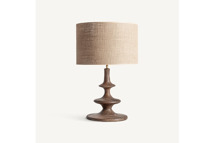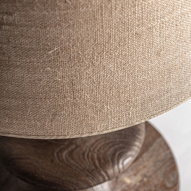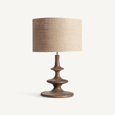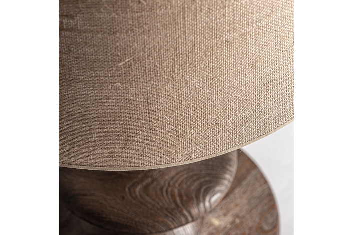 Lámpara de sobremesa, en color marrón, de estilo colonial. Fabricado en madera de mango, combinado con hierro y yute.