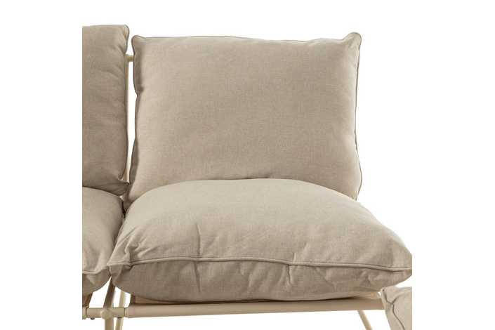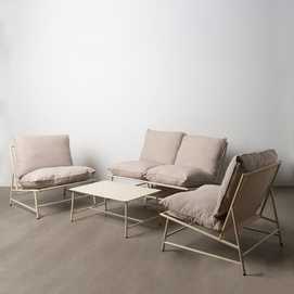 Incluye 1 sofá (136x83,5x82cm), 2 sillones (70x83,5x82cm) y 1 mesa centro (90x50x35cm). Estructura de acero. Base del asiento de textileno (70%PVC, 30% poliéster). Tejido de los cojines 100% olefina. Relleno de algodón de polipropileno. Cojín asiento: 73x67cm. Cojín respaldo: 73x56cm. Desenfundables. Altura asiento: 47cm.