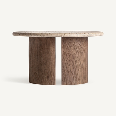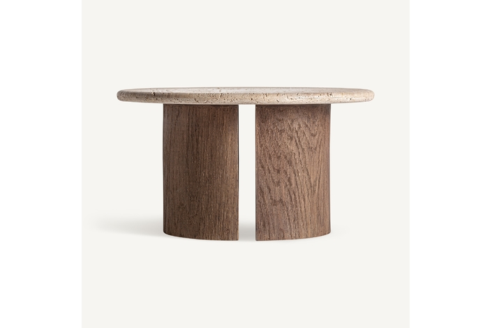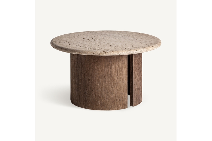 Mesa de centro. Fabricado en madera recuperada, en color marrón, combinado con travertino, en color blanco.