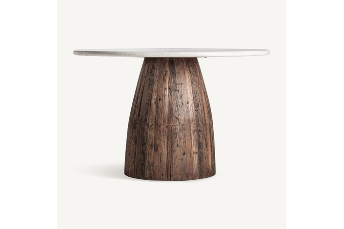 Mesa comedor. Fabricado en madera recuperada, en color marrón, combinado con mármol, en color blanco.