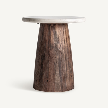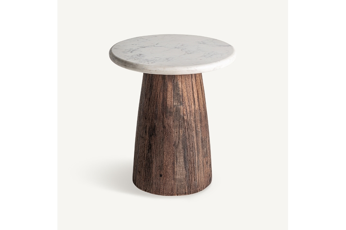 Mesa auxiliar. Fabricado en madera recuperada, en color marrón, combinado con mármol, en color blanco.
