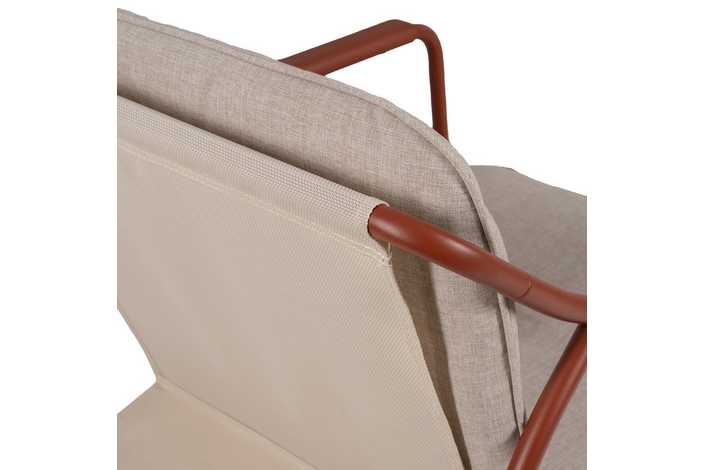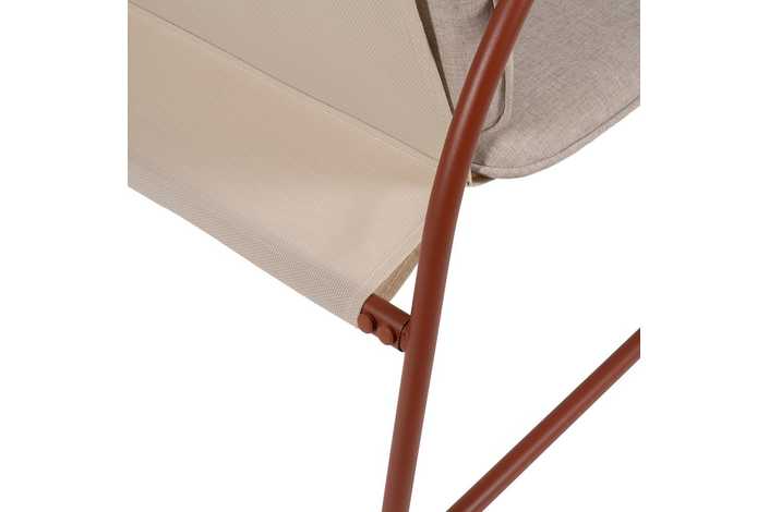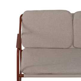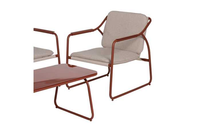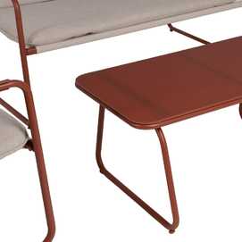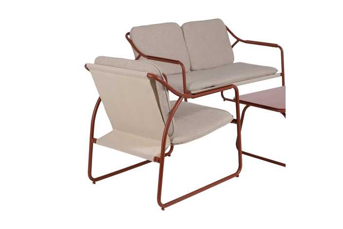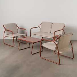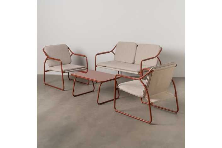 Incluye 1 sofá (118x72,5x75cm), 2 sillones (60x72,5x75cm) y 1 mesa de centro (85x45x41cm). Estructura de acero, tablero de la mesa de cristal templado. Base de los asientos de textileno (70% PVC, 30% poliéster). Tejido de los cojines 100% olefina. Relleno de 5cm de algodón + foam densidad 22 + algodón (3 capas). Altura asientos: 42cm. Ancho asiento: 110cm (sofá), 57cm (sillones). Profundidad asiento: 53cm. Altura respaldo: 41cm. Altura reposabrazos: 21cm. Cumple la normativa EN581 (uso exterior).