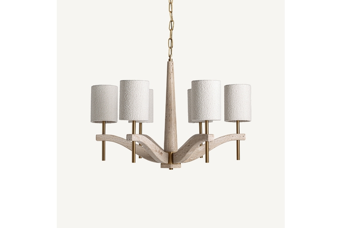 Lámpara de colgar. Fabricado en mármol, en color beige, combinado con metal, en color dorado y poliéster, en color blanco roto.
