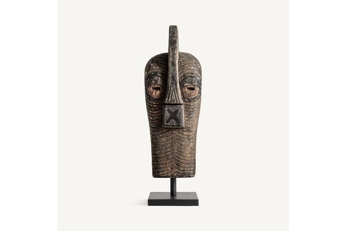 Figura, de estilo étnico. Fabricado en madera de mango, en color marrón envejecido, combinado con hierro, en color negra.