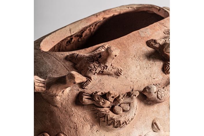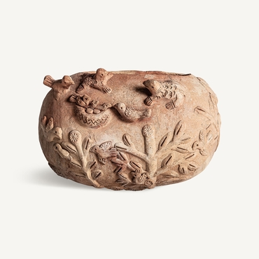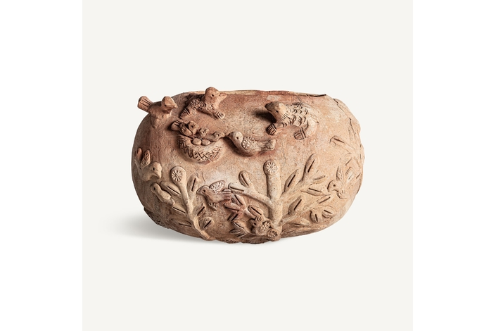 Centro de mesa, en color marrón claro envejecido, de estilo oriental. Fabricado en terracota.