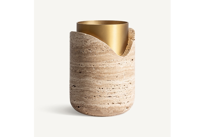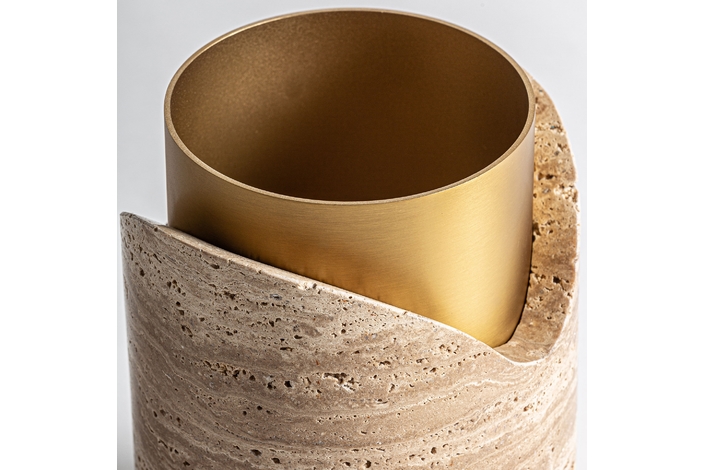 Jarrón verkie, de estilo art deco. Fabricado en mármol, en color crema, combinado con acero, en color oro.