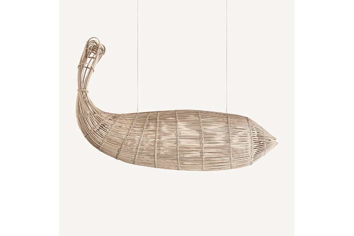 Lámpara de colgar pez de estilo boho, fabricado en ratán en color marrón.