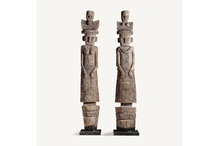 Escultura pie j/2 de estilo étnico, fabricado en madera suar en color marrón con acabado envejecido, combinado con hierro en color negro.