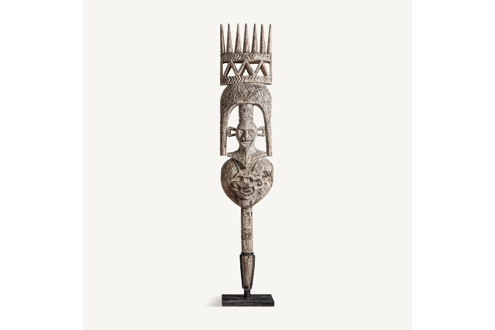 Escultura pie, fabricado en madera suar en color marrón, combinado con hierro en color negro.