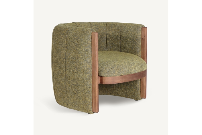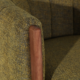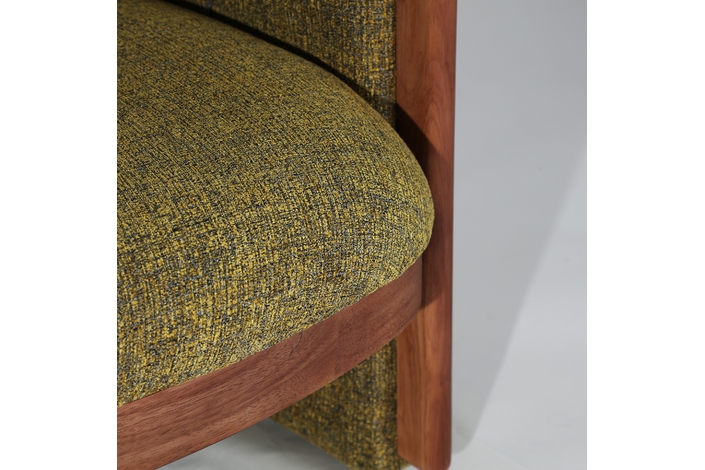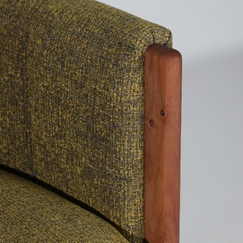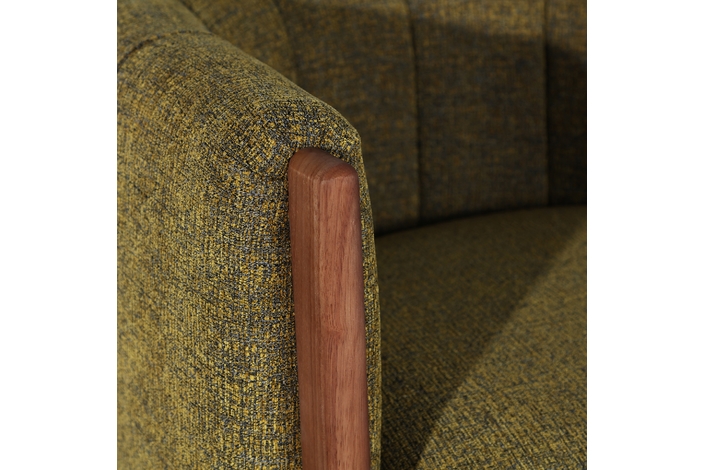 Sillón, fabricado en madera de pino en color marrón, combinado con poliéster en color amarillo con acabado jaspeado y espuma. Tapizado jaspeado en color amarillo,gris y negro. .