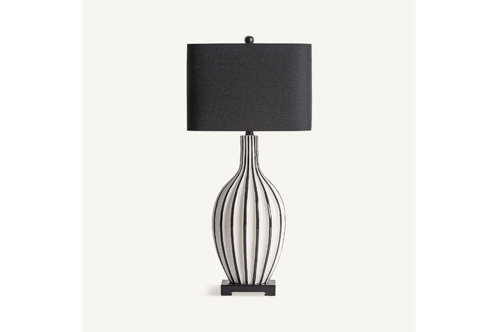 Lámpara de sobremesa, fabricado en cerámica en color blanco, combinado con hierro en color negro y lino en color negro.
