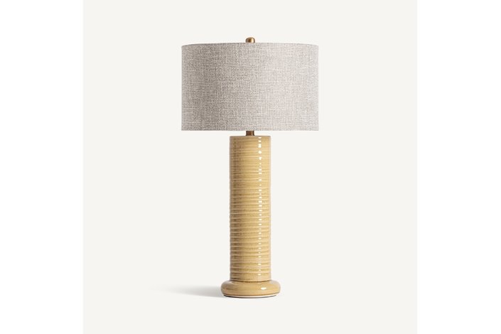 Lámpara de sobremesa de estilo contemporáneo, fabricado en cerámica en color ocre, combinado con lino en color beige y hierro en color oro.