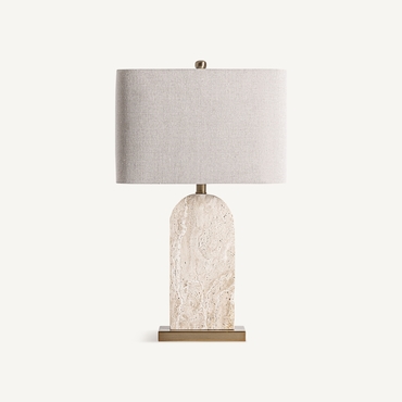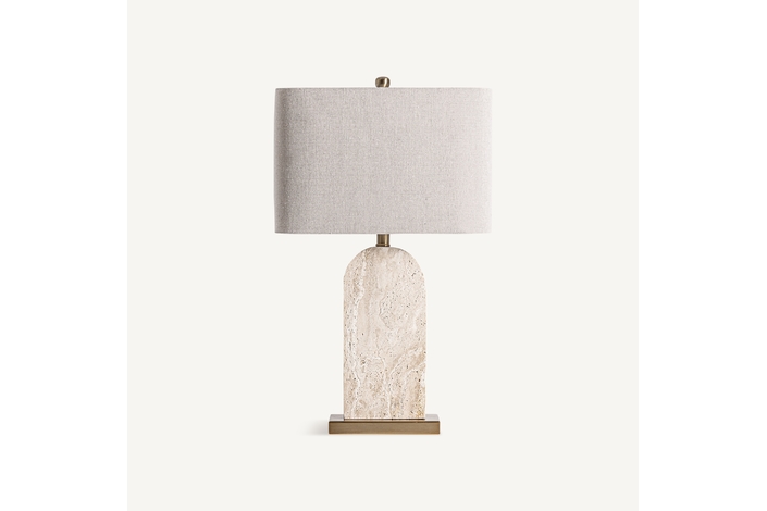 Lámpara de sobremesa de estilo art deco, fabricado en travertino en color marfil, combinado con hierro en color oro y lino en color blanco roto. Producto desmontable.