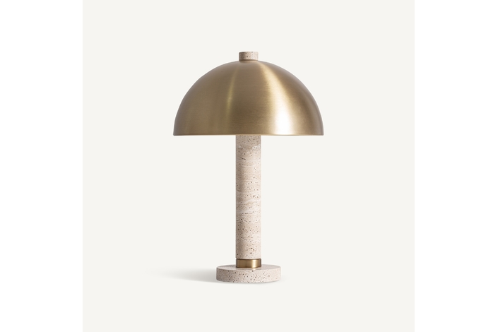 Lámpara de sobremesa de estilo art deco, fabricado en travertino en color marfil, combinado con hierro en color oro. Producto desmontable.