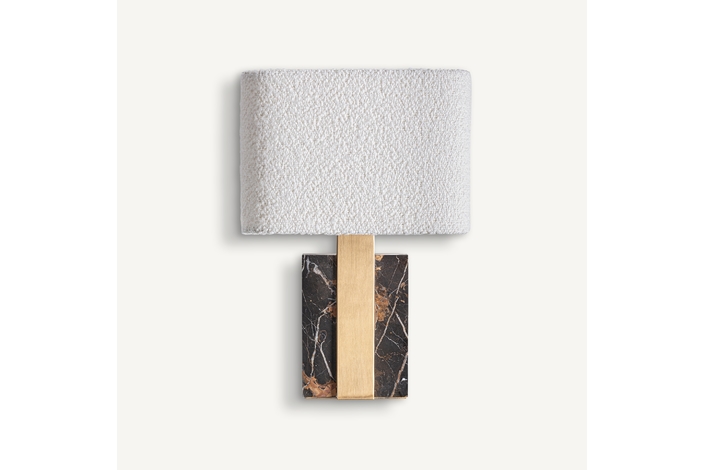Aplique, fabricado en mármol en color blanco, combinado con acero en color bronce y poliéster en color blanco.