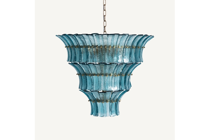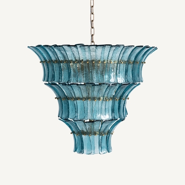 Lámpara de colgar, fabricado en cristal en color azul, combinado con hierro en color cobre.