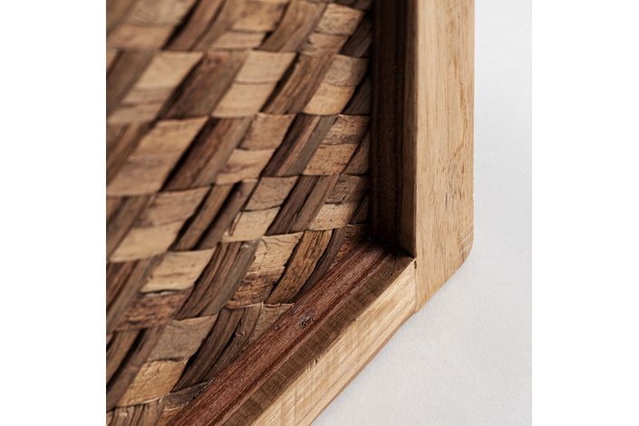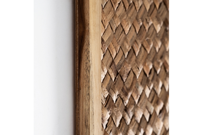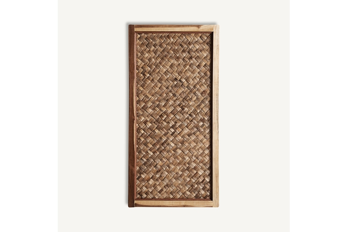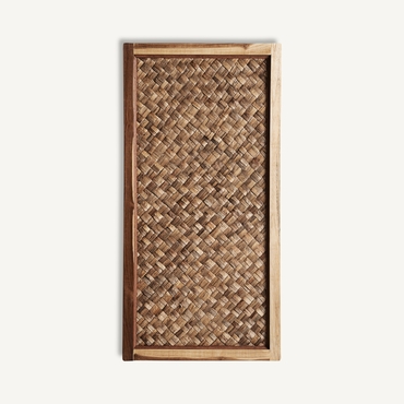 El panel decorativo, en fibra natural marrón, presenta una estética étnica de gran sobriedad. Una pieza de VICAL con presencia y equilibrio.