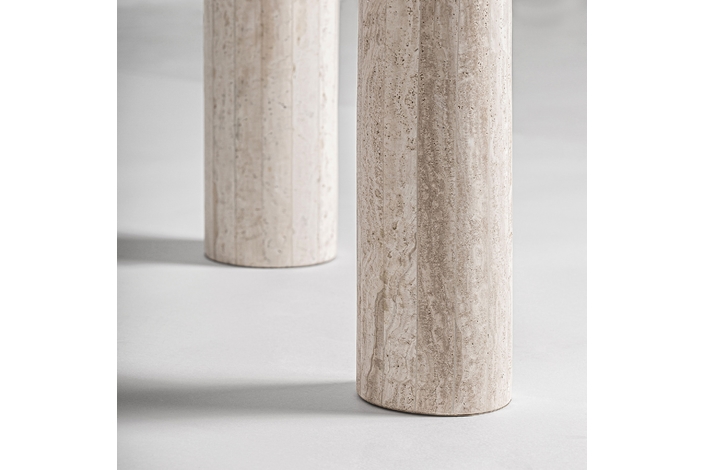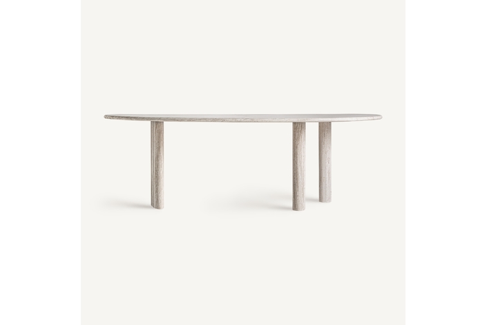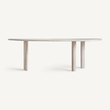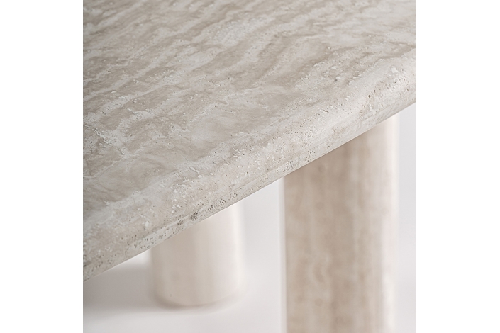 Mesa comedor Thiennes de estilo art deco, fabricado en travertino en color blanco roto. Producto desmontable.