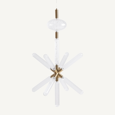 Lámpara de colgar, fabricado en cristal en color transparente, combinado con acero en color bronce.