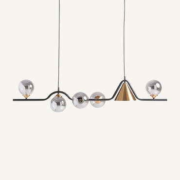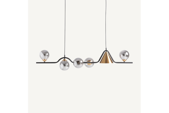 Lámpara de colgar, fabricado en cristal en color gris con acabado ahumado, combinado con acero en color cobre y hierro en color negro.