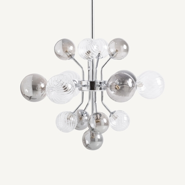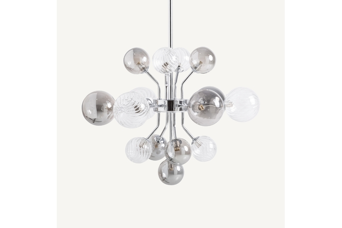 Lámpara de colgar, fabricado en cristal en color gris con acabado ahumado, combinado con acero en color plata.