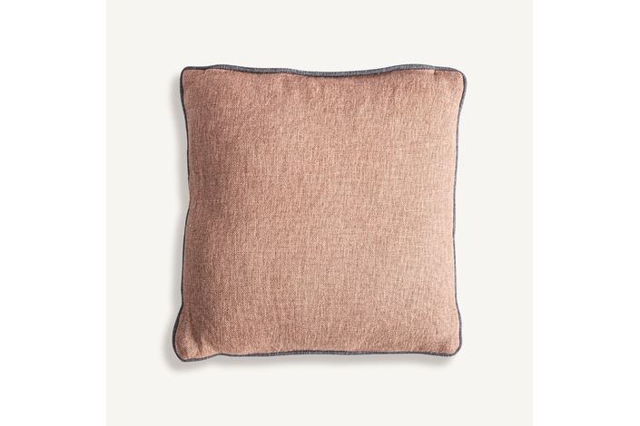 Cojín, fabricado en lino en color terracota, combinado con fibra natural.