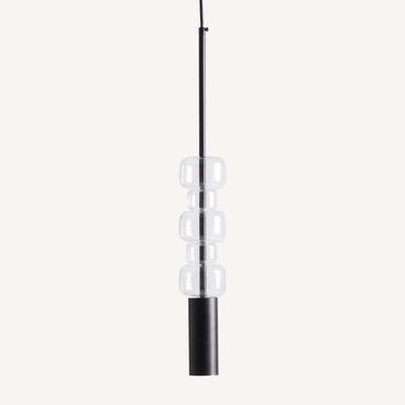 Lámpara de colgar, fabricado en cristal en color transparente, combinado con acero en color negro.