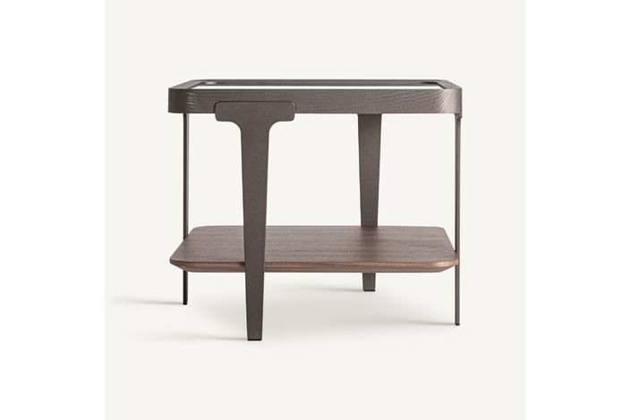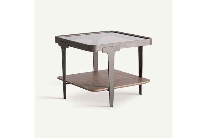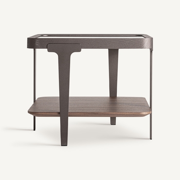 Mesa auxiliar, fabricado en madera de fresno en color marrón, combinado con cristal en color gris con acabado ahumado y hierro en color negro.