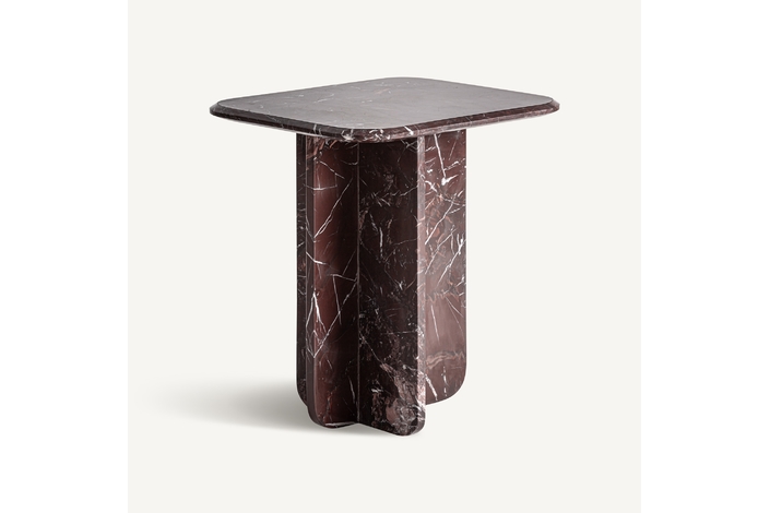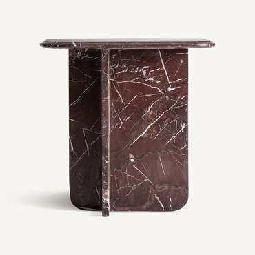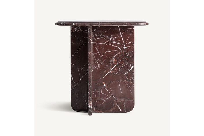 Mesa auxiliar, fabricado en mármol en color rojo oscuro.