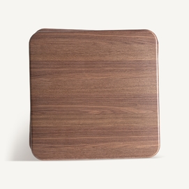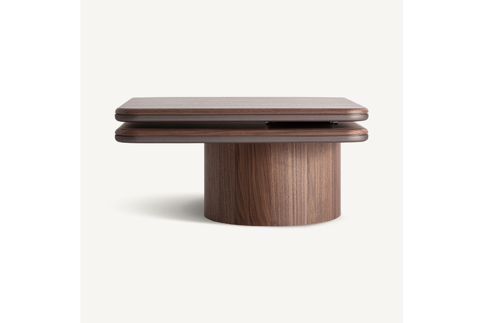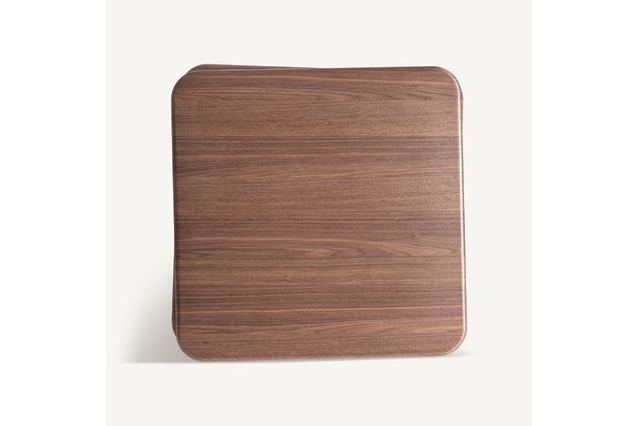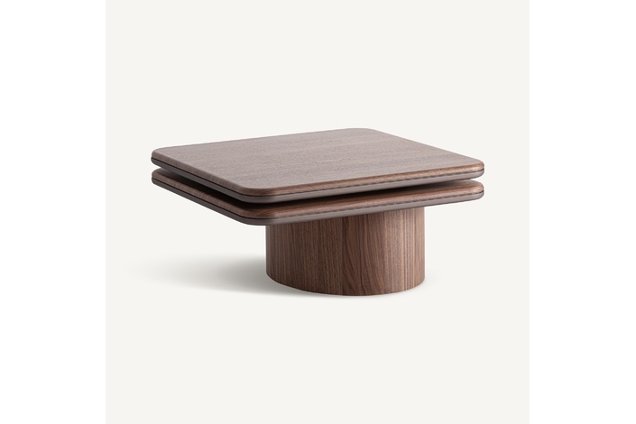 Mesa de centro, fabricado en chapa de nogal en color marrón, combinado con hierro en color marrón.