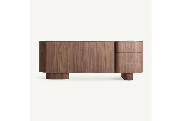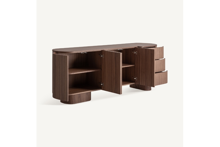Aparador, fabricado en madera dm en color marrón, combinado con chapa de nogal.