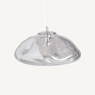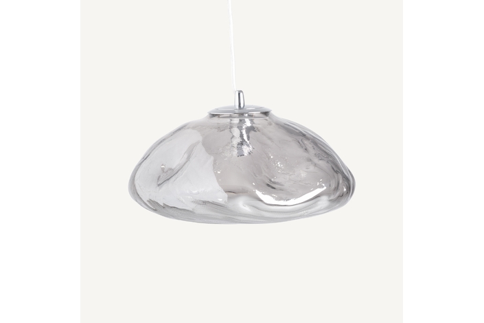 Lámpara de colgar, fabricado en cristal en color gris con acabado ahumado, combinado con hierro en color plata.