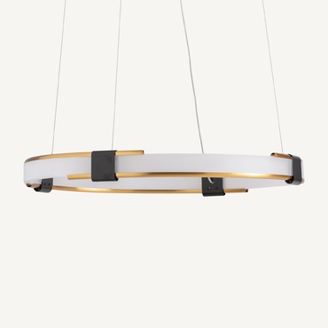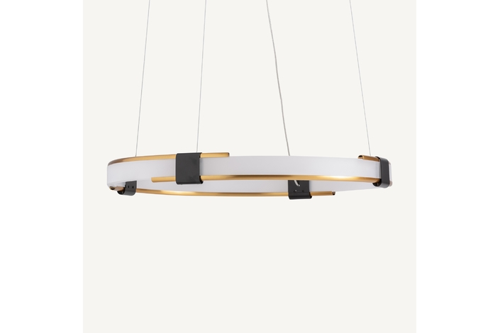 Lámpara de colgar, fabricado en cristal en color blanco, combinado con acero en color dorado en color negro.
