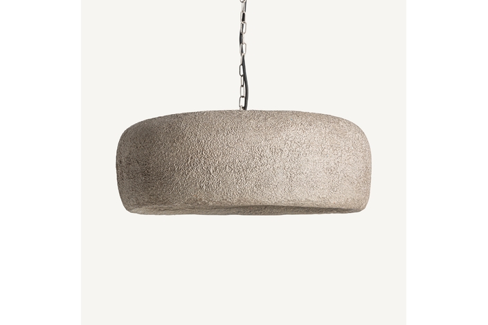 Lámpara de colgar, fabricado en papel maché en color gris, combinado con hierro en color negro.