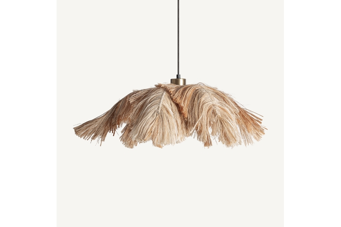 Lámpara de colgar, fabricado en fibra natural en color beige, combinado con hierro en color negro y acero en color dorado.