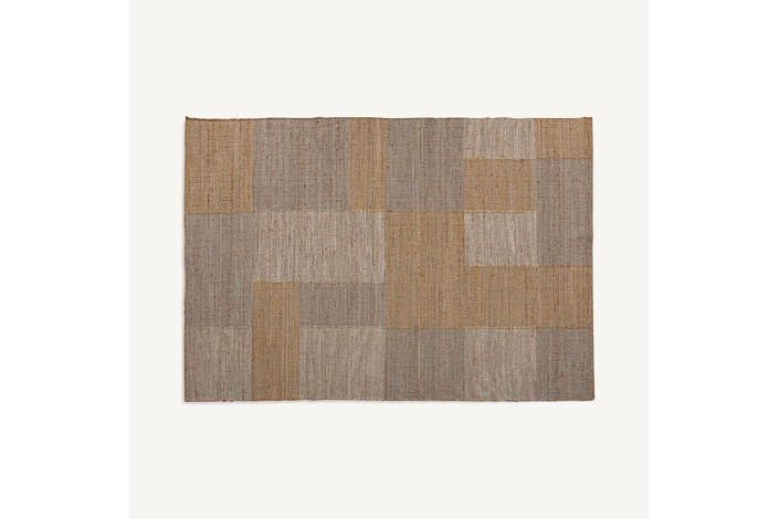 Alfombra, fabricado en yute en color gris, combinado con algodón en color amarillo en color beige.